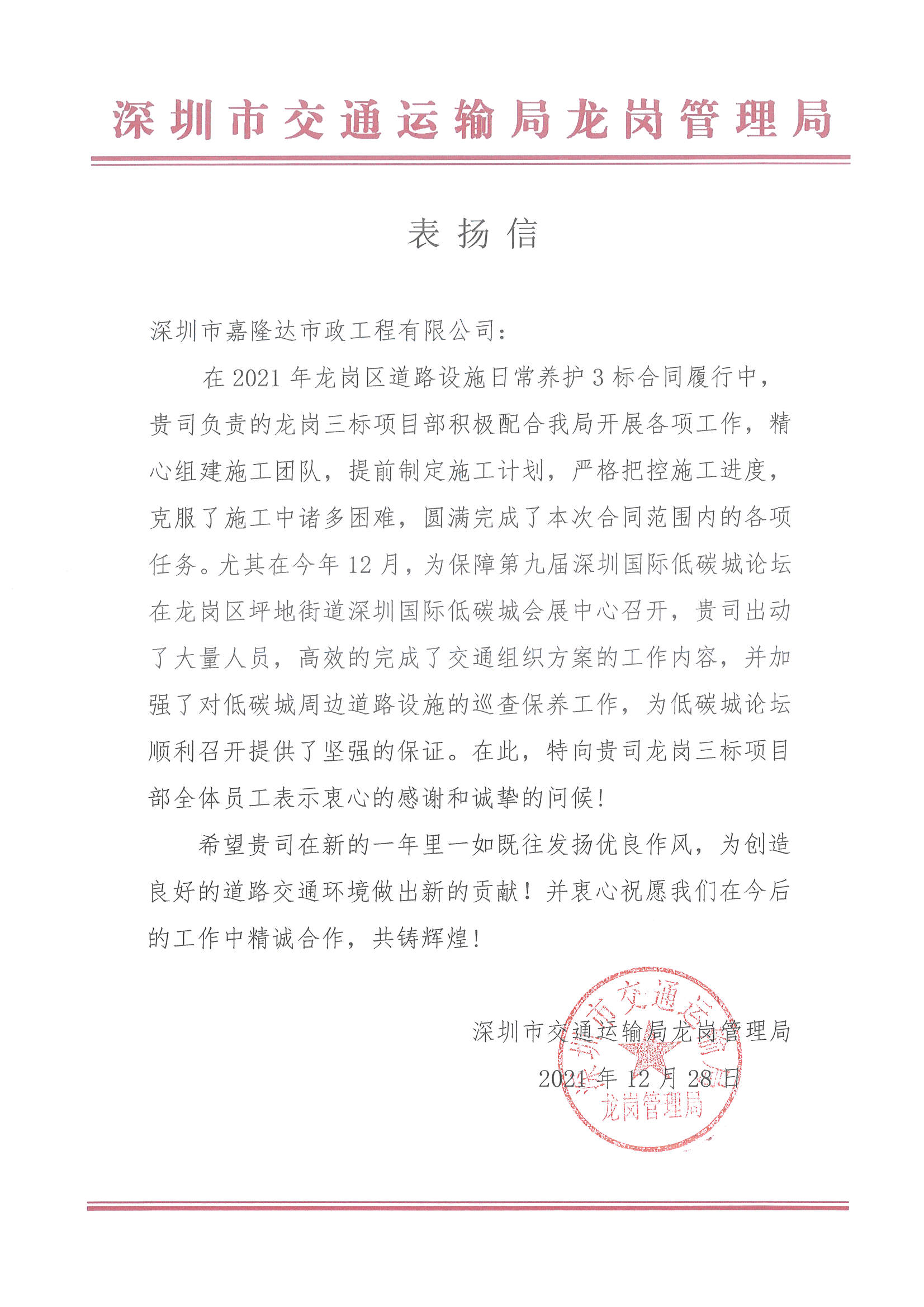 2021年龍崗區(qū)道路設(shè)施日常養(yǎng)護(hù)3標(biāo)-表揚(yáng)信