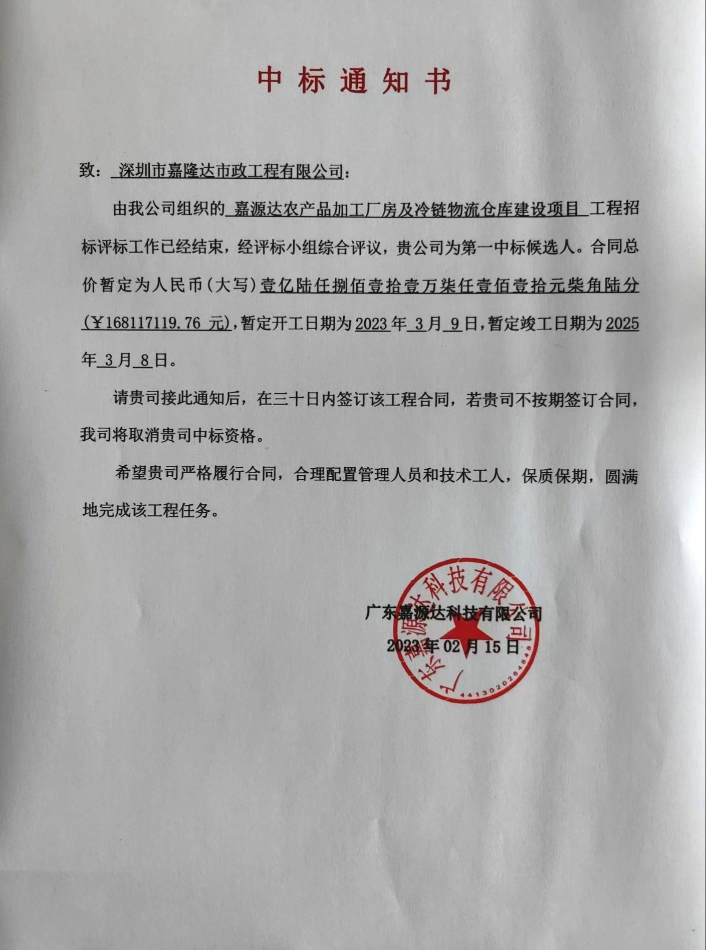 喜訊!公司中標嘉源達農(nóng)產(chǎn)品加工廠房及冷鏈物流倉庫建設項目